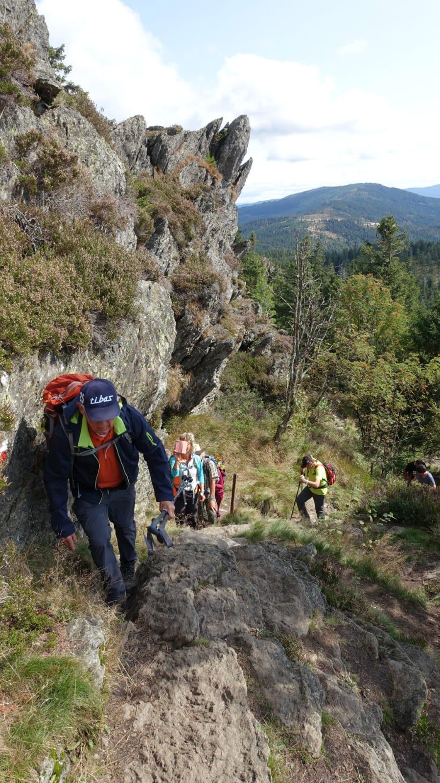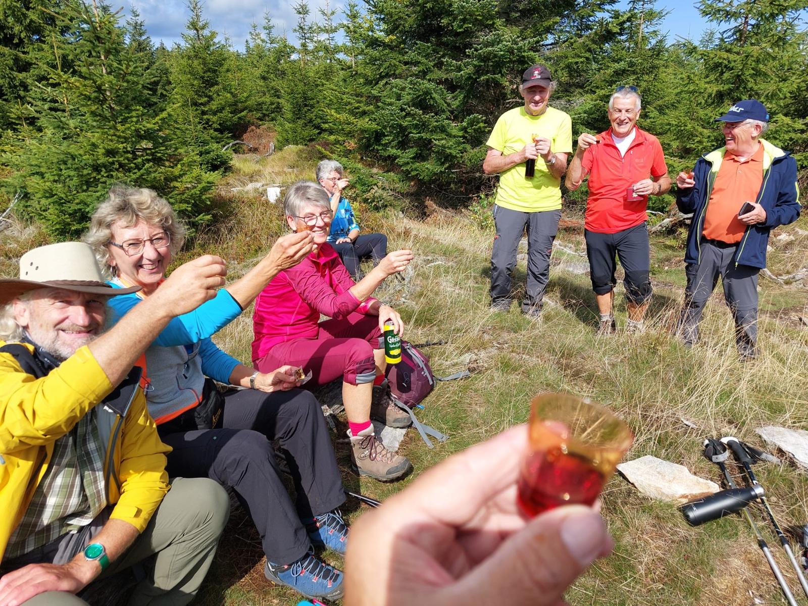 Warum? Weil er da ist, weil er ein wunderschönes Mittelgebirge ist. Der Böhmerwald steht seit zigmillionen Jahren auf der Böhmischen Masse. Von der Further Senke im Westen bis zum Kerschbaumsattel im Osten. Die Idee hatte Franz Schuster, schon lange. Er plante und tüftelte und schließlich fanden sich am Morgen des 29. September 2023 acht Wanderer auf dem Wegscheider Marktplatz ein und es ging los, nach Osten, dem Mühlviertel zu. Über Mistelberg und Stratberg ging es auf den Kühstein hinauf, ein imposanter Rastplatz mit Weitblick. Vorbei am Bretzerhaus überschritten wir die Kleine Mühl und mussten steil hinauf nach Götzendorf und Rohrbach. Am zweiten Tag überquerten wir die Große Mühl beim Haslacher Bahnhof und leisteten der Steinernen Mühl Weggesellschaft, den ganzen Tag lang bis Helfenberg. Der dritte Tag war unsere Königsetappe. Außerdem gesellte sich mit Helga unsere neunte Wandererin dazu. Steil ging’s gleich hinauf zur idyllisch auf weiter Lichtung stehenden Waldkapelle. Dann am Wasserweg des Weißenbaches entlang bis Vorderweißenbach. Unsere Route musste natürlich über den Sternstein führen, einen wahren König des Böhmerwaldes, aber der will schon verdient sein und öffnete die Poren. 27 km legten wir insgesamt bis Reichenthal zurück, das war trotz aller Landschaftsperlen ziemlich anstrengend und die Haltungsnoten der Wanderer sackten ab. Der vierte Tag führte uns nördlich um Freistadt herum, über Rainbach und Grünbach bis Mitterbach. Eine landschaftlich atemberaubende Etappe. Der Tageshöhepunkt war Sankt Michael ob Oberrauchenödt, wo uns ein herrlicher Alpenblick erwartete. Die finale Etappe führte uns über den Viehberg nach Sandl, dann hinauf zum Haubenberg und direkt an der tschechischen Grenze entlang bis Stadlberg, das schon im Waldviertel liegt. Die letzte 1000er Hürde war die Dreifaltigkeitskapelle am Eichelberg, dann stiegen wir ab nach Karlstift. Unser Blick streifte über die unendlichen Wälder des Waldviertels. Nach einer verdienten Einkehr ging es dem Bus heim nach Wegscheid. Und als die Landschaft im Fahrtempo am Busfenster vorbeizog brachte es Sepp Streifinger auf den Punkt: „San mia des ois ganga!?“ Ja, des san ma. Insgesamt etwa 110km und vielleicht 2.800hm, nur wenig Asphalt, viele unmarkierte Feld- und Waldwege, gespickt mit unvergesslichen Erlebnissen. Dem „Männerhochbeet“ in Pressleiten, der Birnenspende in Götzendorf, der Todsündenkanzel in Reichenthal, dem gemütlichen Ratsch am Viehberg und den vielen netten Wirtsleuten in unseren Quartieren. Die mit Abstand beste Zutat war die Wandergruppe. Lauter nette, megade Leit. Nicht einmal das traumhafte Wetter konnte diese Supertruppe toppen. Es war einfach so schön und der Franz bekam für seine Routenwahl und Organisation ziemlich dickes Lob aufgestrichen. Für ihn ist die Idee wahr geworden.