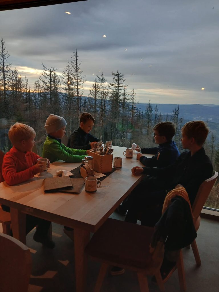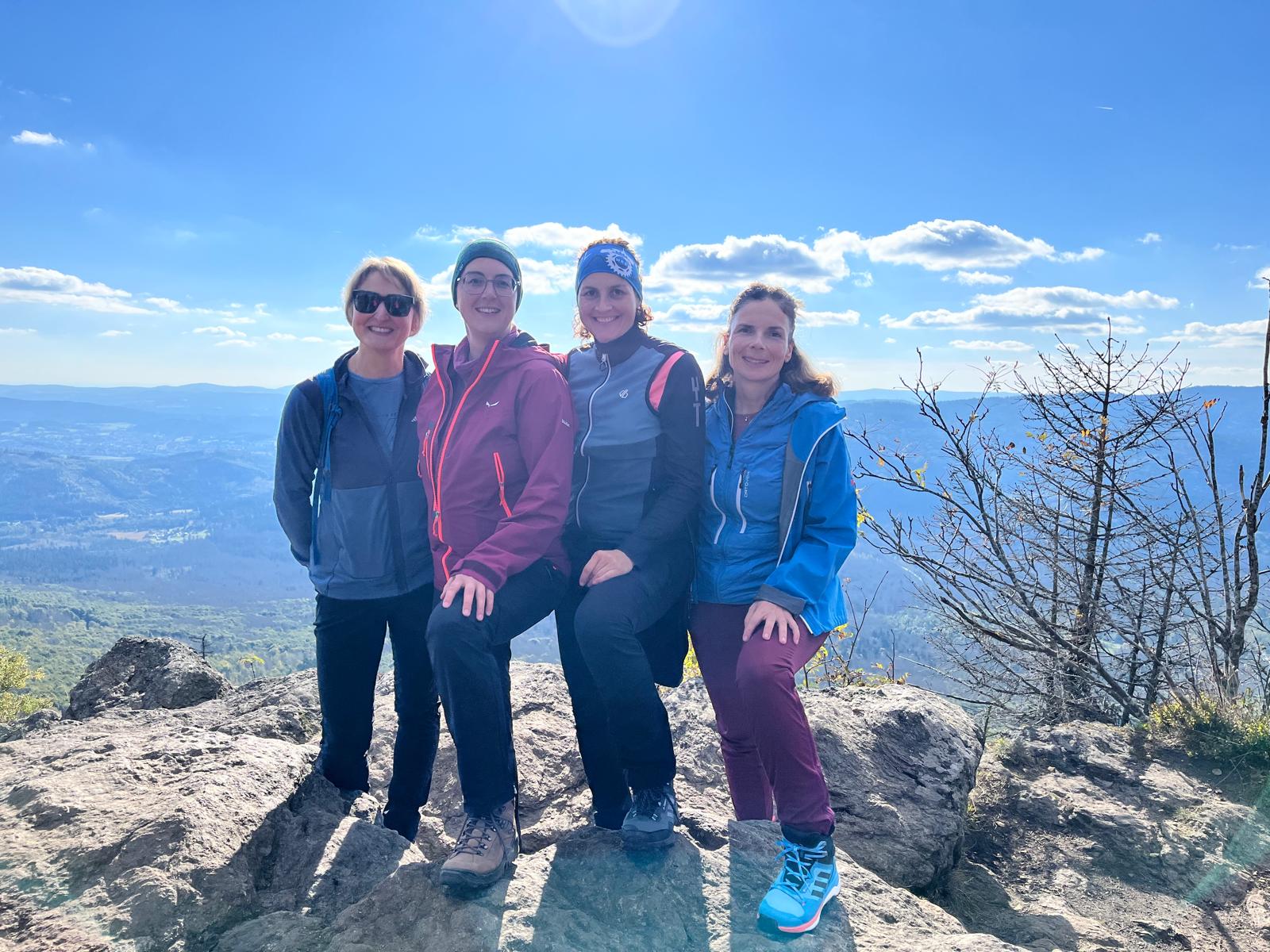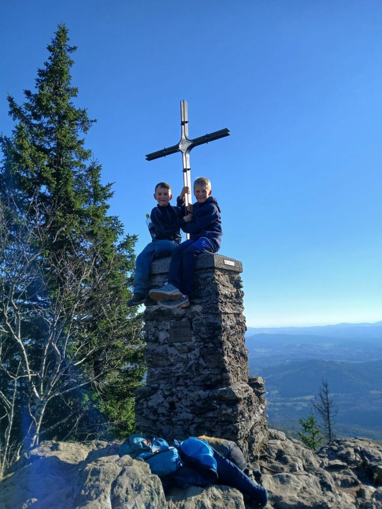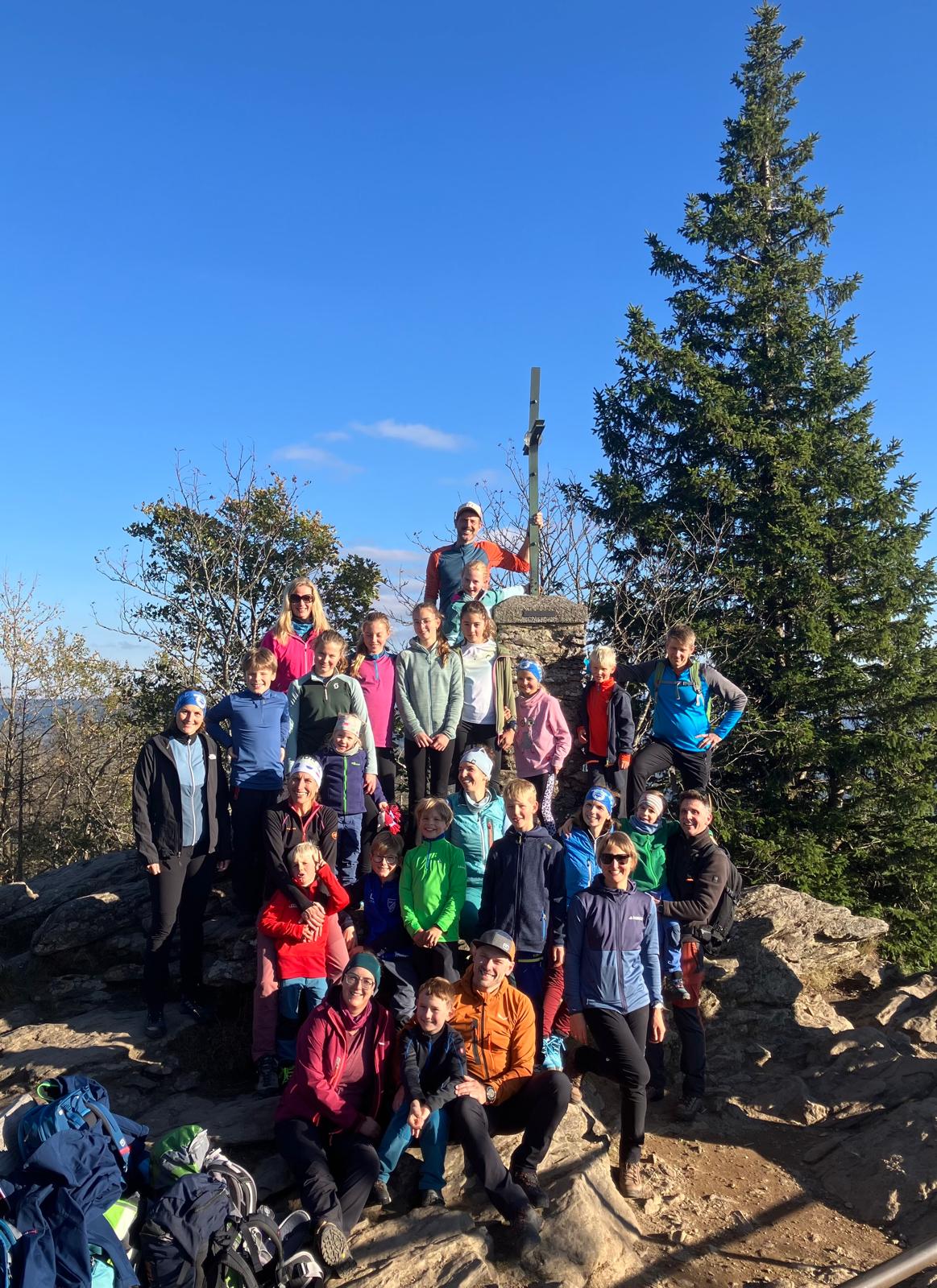 Nach einer verdienten Mittagspause im Dreisesselschutzhaus wurde die Gruppe noch mit einer fantastischen Alpenfernsicht belohnt. Auch der ein oder andere Sonnenstrahl kam durch! Jugendwartin Karin Windpassinger bestieg mit den Woidkids noch den Gipfel (Hochstein) und die „Drei Sessel). Dabei blies uns der Böhmwind kräftig um die Ohren.